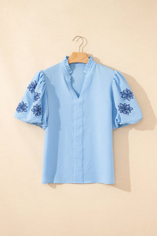 Blue Blooms Embroidered Puff Sleeve Blouse