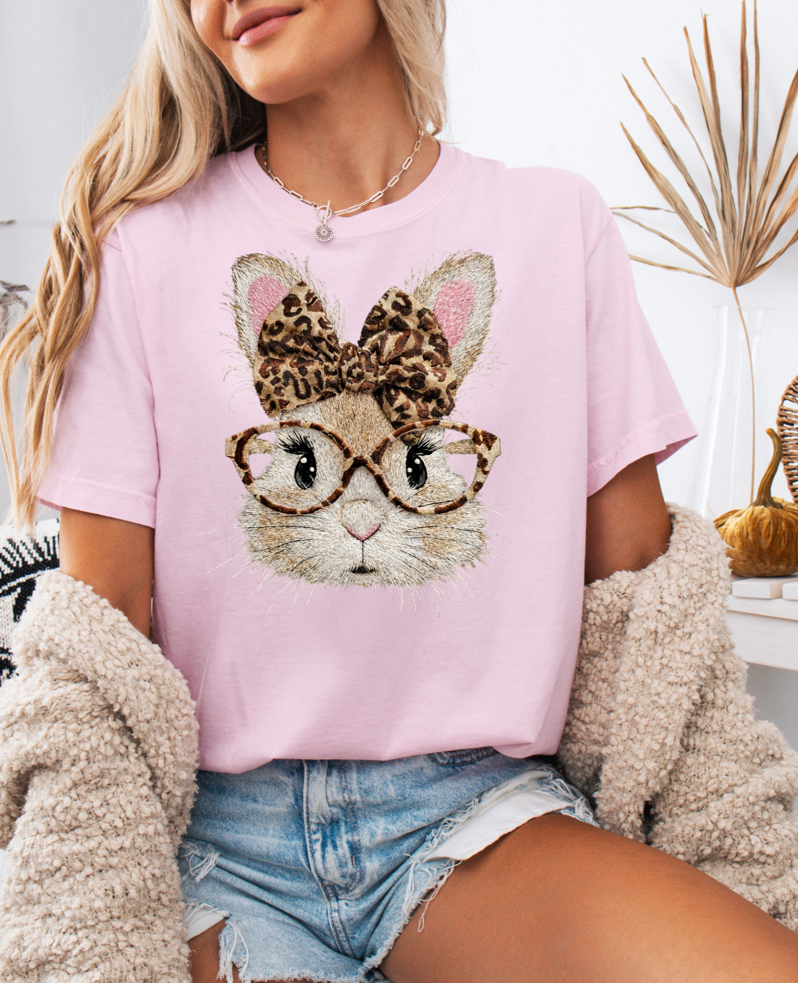 • Cute bunny graphic with leopard print bow and glasses