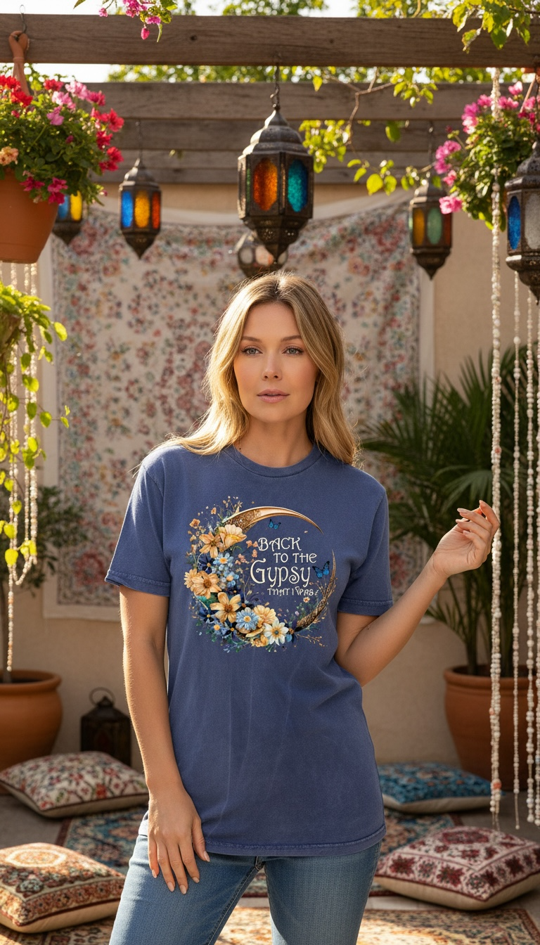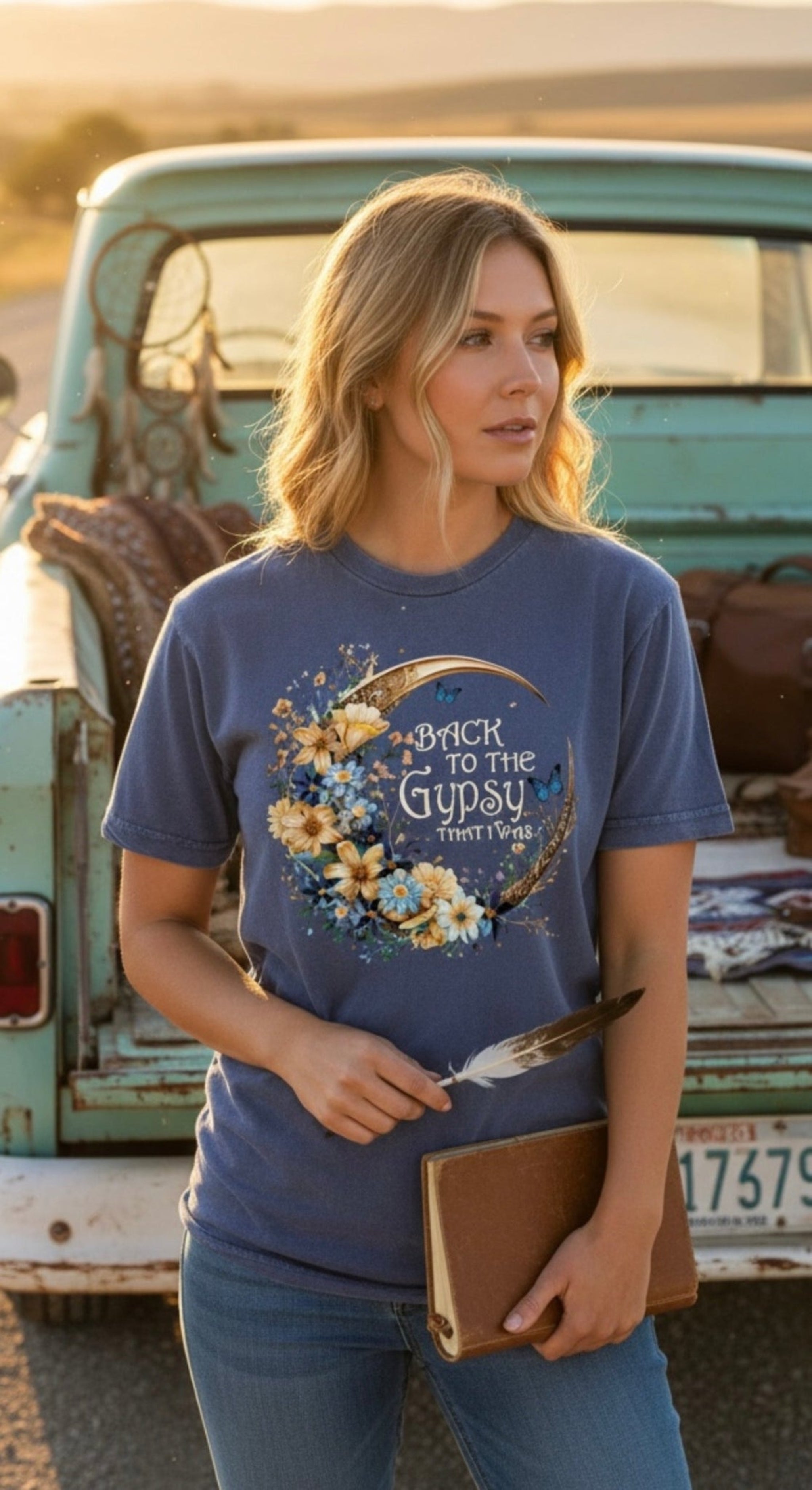 Embrace your free spirit with this vintage-inspired graphic tee featuring a beautiful floral wreath design and the phrase "Back to the Gypsy That I Was." Perfect for adding a bohemian touch to your casual wardrobe.