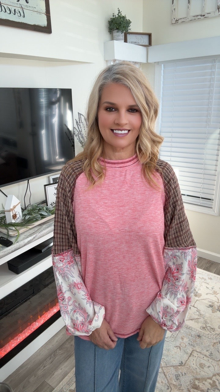 Soft, sweet, and effortlessly stylish — the Petals & Plaid Top is one of those pieces you’ll reach for again and again. Featuring a flattering blush body paired with mixed-print sleeves, this top brings the perfect blend of feminine florals and classic plaid for a look that feels cozy yet elevated.