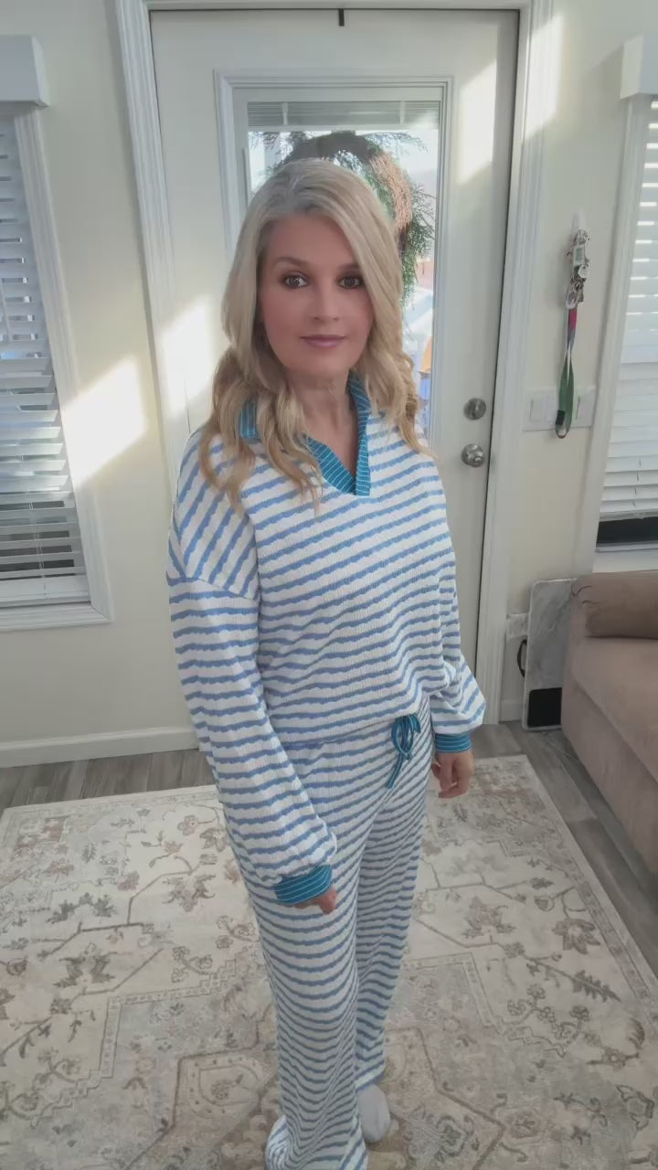 Relax in style with this blue striped loungewear set featuring a cozy pullover and matching wide-leg pants. Made from soft, plush fabric with classic blue and white stripes, this two-piece lounge set combines comfort with nautical-inspired charm.