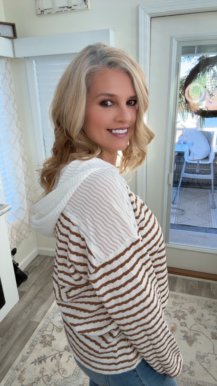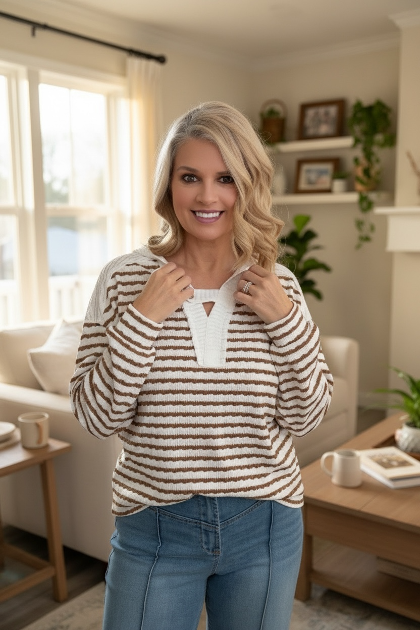 Easy, effortless, and made for everyday wear. The Soft Stripe Weekend Henley features a lightweight textured knit with classic neutral stripes, a relaxed hooded design, and a functional button neckline for that perfectly casual feel. Soft against the skin and breathable, this top is ideal for layering or wearing on its own through every season.