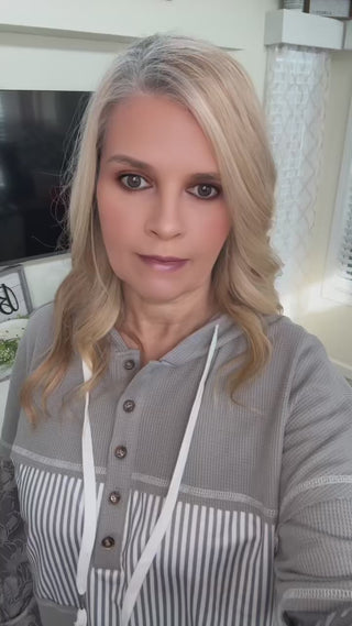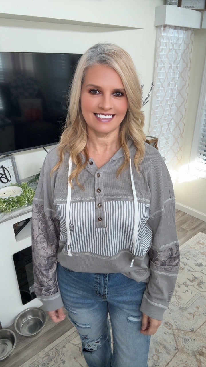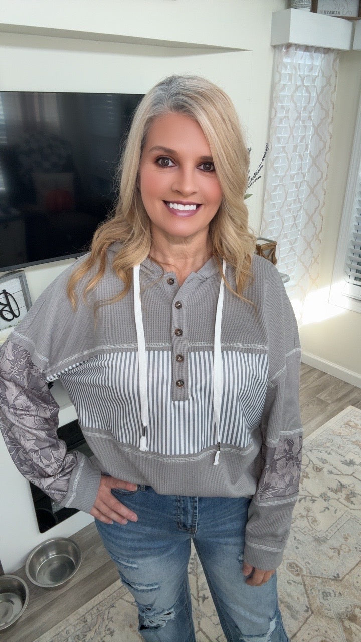 Stay cozy in style with this striped color block hoodie featuring camo sleeves. This thermal waffle knit pullover combines classic gray and white stripes with camo details for a look that's both comfortable and eye-catching.