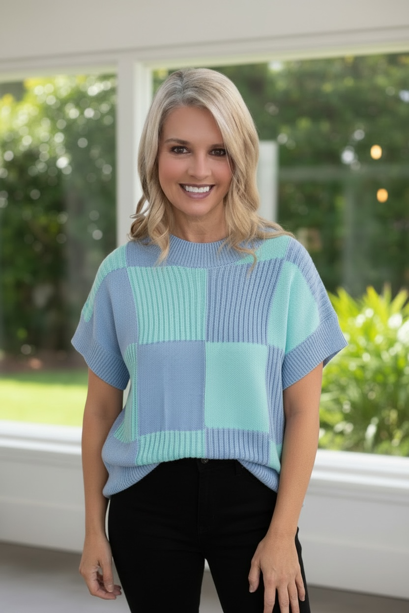 Embrace effortless style with this stunning color block knit sweater. Featuring a beautiful blend of soft blue and mint tones in a patchwork design, this short-sleeve sweater combines comfort with contemporary fashion.