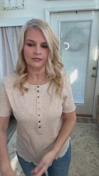 Elevate your basics with this ribbed henley top in soft beige. Featuring a classic button-front placket and textured ribbed knit fabric, this short sleeve henley combines timeless style with everyday comfort.